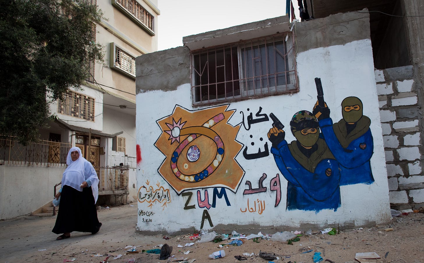 A woman walks past a mural for an internet café popular with video game players. Western reporters labeled this same wall a “militant office,” not because of evidence, but because they could not read…